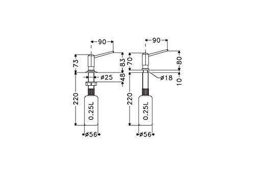 Complemento perfecto a los grifos de cocina. Es muy importante tener en cuenta que ni siquiera para cargar el contenedor es preciso acceder por dentro del mueble, puesto que la carga se efectúa por arriba, solo extrayendo el cabezal. Con una simple presión sobre el cabezal, un chorro de jabón líquido se pone a nuestro servicio. Recarga superior. Utilizable con cualquier detergente líquido. Medidas: